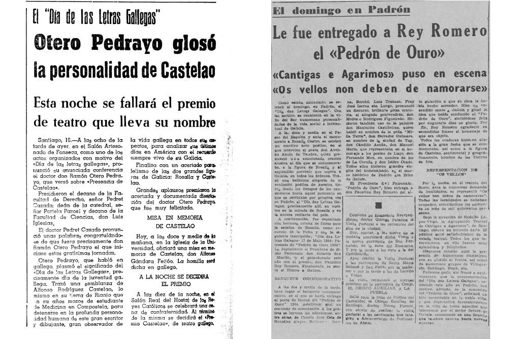 Mención á parte merece a convocatoria ese mesmo ano do primeiro Premio “Castelao” de teatro galego. Este foi unha creación da asociación cultural “O Galo” de Santiago de Compostela en resposta á ausencia dunha modalidade en lingua galega nun concurso de teatro universitario convocado polo sindicato franquista SEU. Aínda que o nome escollido para o premio reflectía a importancia de Castelao como autor teatral pola súa obra Os vellos non deben de namorarse, tamén tiña unha forte carga simbólica debido ao papel xogado por el na historia recente de Galicia. Nesa primeira edición, o Premio recaeu na obra Cando morren os faroles, de Ángel de la Peña Carrillo. O fallo do xurado deuse a coñecer o mesmo Día das Letras no decurso dunha cea na que estiveron presentes Ramón Otero Pedrayo e o Presidente da Real Academia Galega, Sebastián Martínez-Risco. Na conclusión do acto Otero Pedrayo evocou a figura de Castelao e cantouse o Himno Galego.