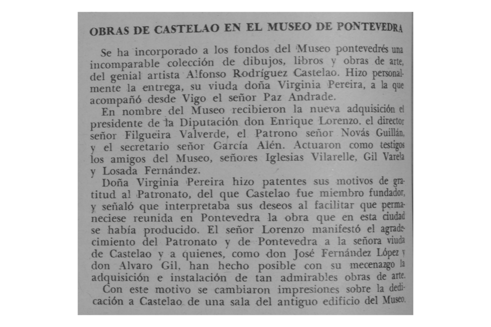 Coincidindo coa dedicatoria do Día das Letras Galegas a Castelao, ese mesmo ano tiveron lugar dous acontecementos relevantes relacionados co seu legado. Por unha parte, a Real Academia Galega recibiu da sociedade “Aguas de Mondariz de Hijos de Peinador, S. A.” os tres grandes lenzos con temática de cegos que Castelao realizara para o Balneario de Mondariz entre 1913 e 1914. O depósito destas importantes obras de arte logrouse pola mediación do académico Isidro Parga Pondal, quen estaba unido por vencellos familiares aos fundadores do Balneario. Por outra parte, en 1964 Virginia Pereira visita por segunda vez Galicia e chega a un acordo co Museo de Pontevedra para entregar a esa institución varios orixinais do seu finado esposo e para lle ceder os dereitos de todos os materiais de Castelao depositados no Museo a cambio dunha compensación económica.