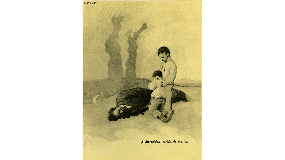 A funcionalidade do texto breve, evocador e ateigado de implicaturas contextualizadas, culmina na serie de debuxos de Castelao sobre a Guerra Civil. Tamén nos 12 debuxos de negros, realizados durante a súa estadía en Cuba a finais dos anos trinta. Un home caído no chan observado por dous nenos pode ser moitas cousas e ningunha en concreto. Mais, cando ao pé se le “A derradeira lección do mestre”, a obra condensa todo un trauma histórico e dálle expresión artística. Velaí a arte de Castelao: unha arte da confluencia, da interseccionalidade, da mestizaxe e da suxestión. Pechando sempre coa palabra xusta, que se converte na luz que ilumina e revela o significado.