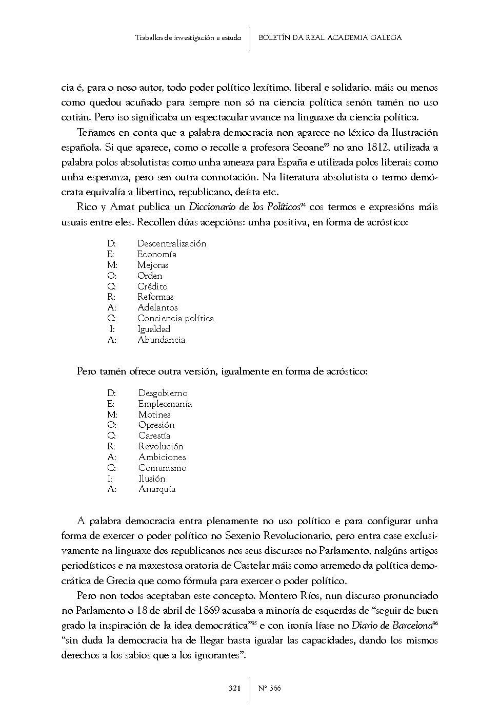 cia é, para o noso autor, todo poder político lexítimo, liberal e solidario, máis ou menos como quedou acuñado para sempre non só na ciencia política senón tamén no uso cotián. Pero iso significaba un espectacular avance na linguaxe da ciencia política. Teñamos en conta que a palabra democracia non aparece no léxico da Ilustración española. Si que aparece, como o recolle a profesora Seoane93 no ano 1812, utilizada a palabra polos absolutistas como unha ameaza para España e utilizada polos liberais como unha esperanza, pero sen outra connotación. Na literatura absolutista o termo demócrata equivalía a libertino, republicano, deísta etc. Rico y Amat publica un Diccionario de los Políticos94 cos termos e expresións máis usuais entre eles. Recollen dúas acepcións: unha positiva, en forma de acróstico: