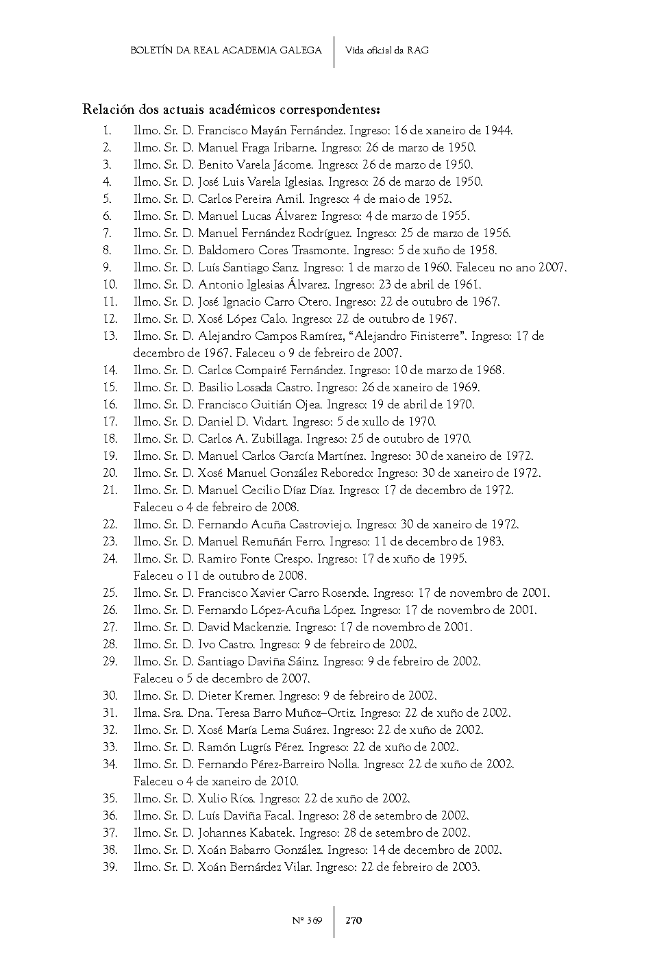 1. 2. 3. 4. 5. 6. 7. 8. 9. 10. 11. 12. 13. 14. 15. 16. 17. 18. 19. 20. 21. 22. 23. 24. 25. 26. 27. 28. 29. 30. 31. 32. 33. 34. 35. 36. 37. 38. 39. Ilmo. Sr. D. Francisco Mayán Fernández. Ingreso: 16 de xaneiro de 1944. Ilmo. Sr. D. Manuel Fraga Iribarne. Ingreso: 26 de marzo de 1950. Ilmo. Sr. D. Benito Varela Jácome. Ingreso: 26 de marzo de 1950. Ilmo. Sr. D. José Luis Varela Iglesias. Ingreso: 26 de marzo de 1950. Ilmo. Sr. D. Carlos Pereira Amil. Ingreso: 4 de maio de 1952. Ilmo. Sr. D. Manuel Lucas Álvarez: Ingreso: 4 de marzo de 1955. Ilmo. Sr. D. Manuel Fernández Rodríguez. Ingreso: 25 de marzo de 1956. Ilmo. Sr. D. Baldomero Cores Trasmonte. Ingreso: 5 de xuño de 1958. Ilmo. Sr. D. Luís Santiago Sanz. Ingreso: 1 de marzo de 1960. Faleceu no ano 2007. Ilmo. Sr. D. Antonio Iglesias Álvarez. Ingreso: 23 de abril de 1961. Ilmo. Sr. D. José Ignacio Carro Otero. Ingreso: 22 de outubro de 1967. Ilmo. Sr. D. Xosé López Calo. Ingreso: 22 de outubro de 1967. Ilmo. Sr. D. Alejandro Campos Ramírez, ?Alejandro Finisterre?. Ingreso: 17 de decembro de 1967. Faleceu o 9 de febreiro de 2007. Ilmo. Sr. D. Carlos Compairé Fernández. Ingreso: 10 de marzo de 1968. Ilmo. Sr. D. Basilio Losada Castro. Ingreso: 26 de xaneiro de 1969. Ilmo. Sr. D. Francisco Guitián Ojea. Ingreso: 19 de abril de 1970. Ilmo. Sr. D. Daniel D. Vidart. Ingreso: 5 de xullo de 1970. Ilmo. Sr. D. Carlos A. Zubillaga. Ingreso: 25 de outubro de 1970. Ilmo. Sr. D. Manuel Carlos García Martínez. Ingreso: 30 de xaneiro de 1972. Ilmo. Sr. D. Xosé Manuel González Reboredo: Ingreso: 30 de xaneiro de 1972. Ilmo. Sr. D. Manuel Cecilio Díaz Díaz. Ingreso: 17 de decembro de 1972. Faleceu o 4 de febreiro de 2008. Ilmo. Sr. D. Fernando Acuña Castroviejo. Ingreso: 30 de xaneiro de 1972. Ilmo. Sr. D. Manuel Remuñán Ferro. Ingreso: 11 de decembro de 1983. Ilmo. Sr. D. Ramiro Fonte Crespo. Ingreso: 17 de xuño de 1995. Faleceu o 11 de outubro de 2008. Ilmo. Sr. D. Francisco Xavier Carro Rosende. Ingreso: 17 de novembro de 2001. Ilmo. Sr. D. Fernando LópezAcuña López. Ingreso: 17 de novembro de 2001. Ilmo. Sr. D. David Mackenzie. Ingreso: 17 de novembro de 2001. Ilmo. Sr. D. Ivo Castro. Ingreso: 9 de febreiro de 2002. Ilmo. Sr. D. Santiago Daviña Sáinz. Ingreso: 9 de febreiro de 2002. Faleceu o 5 de decembro de 2007. Ilmo. Sr. D. Dieter Kremer. Ingreso: 9 de febreiro de 2002. Ilma. Sra. Dna. Teresa Barro Muñoz?Ortiz. Ingreso: 22 de xuño de 2002. Ilmo. Sr. D. Xosé María Lema Suárez. Ingreso: 22 de xuño de 2002. Ilmo. Sr. D. Ramón Lugrís Pérez. Ingreso: 22 de xuño de 2002. Ilmo. Sr. D. Fernando PérezBarreiro Nolla. Ingreso: 22 de xuño de 2002. Faleceu o 4 de xaneiro de 2010. Ilmo. Sr. D. Xulio Ríos. Ingreso: 22 de xuño de 2002. Ilmo. Sr. D. Luís Daviña Facal. Ingreso: 28 de setembro de 2002. Ilmo. Sr. D. Johannes Kabatek. Ingreso: 28 de setembro de 2002. Ilmo. Sr. D. Xoán Babarro González. Ingreso: 14 de decembro de 2002. Ilmo. Sr. D. Xoán Bernárdez Vilar. Ingreso: 22 de febreiro de 2003.