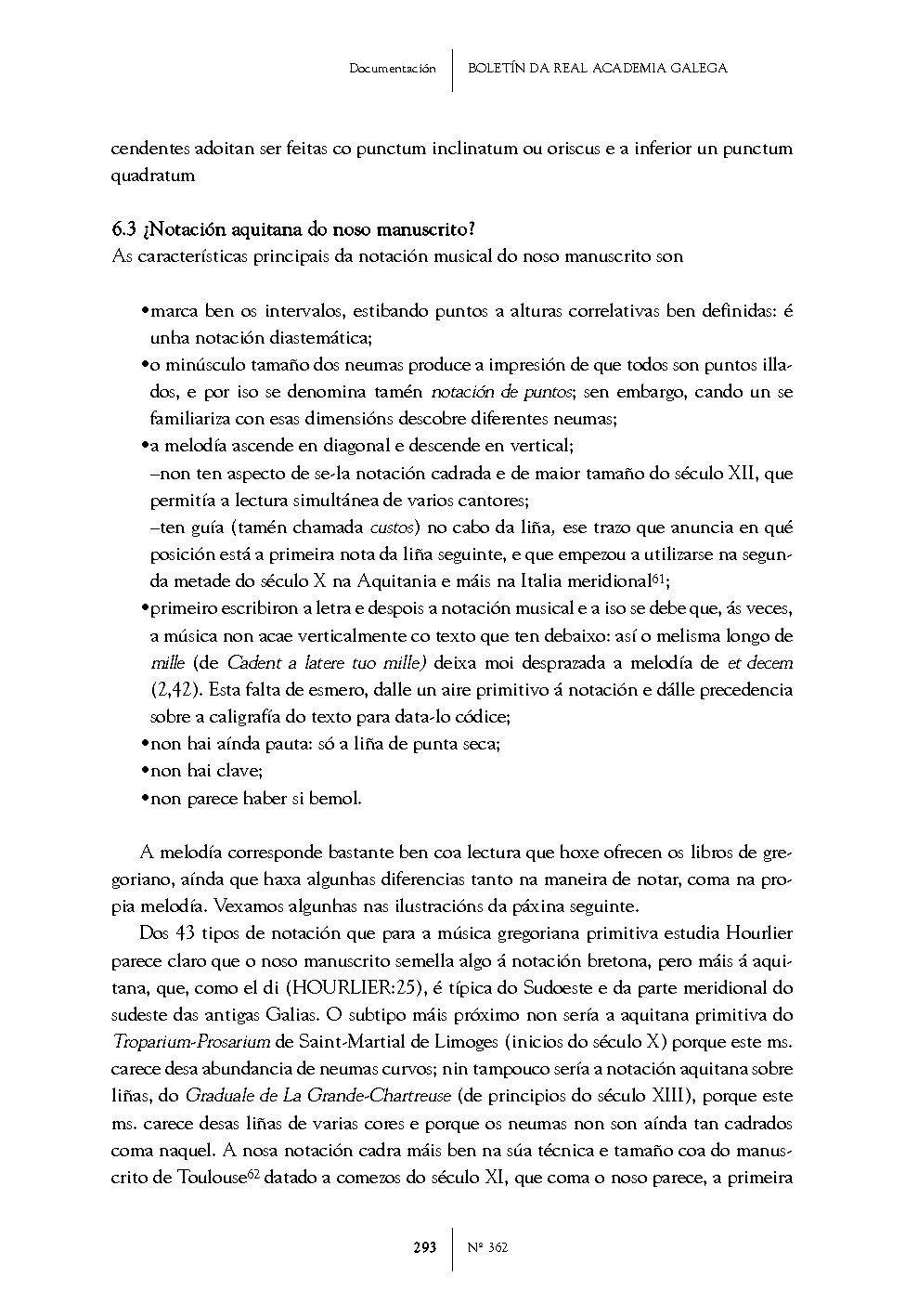 cendentes adoitan ser feitas co punctum inclinatum ou oriscus e a inferior un punctum quadratum 6.3 ¿Notación aquitana do noso manuscrito? As características principais da notación musical do noso manuscrito son ?marca ben os intervalos, estibando puntos a alturas correlativas ben definidas: é unha notación diastemática; ?o minúsculo tamaño dos neumas produce a impresión de que todos son puntos illados, e por iso se denomina tamén notación de puntos; sen embargo, cando un se familiariza con esas dimensións descobre diferentes neumas; ?a melodía ascende en diagonal e descende en vertical; ?non ten aspecto de sela notación cadrada e de maior tamaño do século XII, que permitía a lectura simultánea de varios cantores; ?ten guía (tamén chamada custos) no cabo da liña, ese trazo que anuncia en qué posición está a primeira nota da liña seguinte, e que empezou a utilizarse na segunda metade do século X na Aquitania e máis na Italia meridional61; ?primeiro escribiron a letra e despois a notación musical e a iso se debe que, ás veces, a música non acae verticalmente co texto que ten debaixo: así o melisma longo de mille (de Cadent a latere tuo mille) deixa moi desprazada a melodía de et decem (2,42). Esta falta de esmero, dalle un aire primitivo á notación e dálle precedencia sobre a caligrafía do texto para datalo códice; ?non hai aínda pauta: só a liña de punta seca; ?non hai clave; ?non parece haber si bemol. A melodía corresponde bastante ben coa lectura que hoxe ofrecen os libros de gregoriano, aínda que haxa algunhas diferencias tanto na maneira de notar, coma na propia melodía. Vexamos algunhas nas ilustracións da páxina seguinte. Dos 43 tipos de notación que para a música gregoriana primitiva estudia Hourlier parece claro que o noso manuscrito semella algo á notación bretona, pero máis á aquitana, que, como el di (HOURLIER:25), é típica do Sudoeste e da parte meridional do sudeste das antigas Galias. O subtipo máis próximo non sería a aquitana primitiva do TropariumProsarium de SaintMartial de Limoges (inicios do século X) porque este ms. carece desa abundancia de neumas curvos; nin tampouco sería a notación aquitana sobre liñas, do Graduale de La GrandeChartreuse (de principios do século XIII), porque este ms. carece desas liñas de varias cores e porque os neumas non son aínda tan cadrados coma naquel. A nosa notación cadra máis ben na súa técnica e tamaño coa do manuscrito de Toulouse62 datado a comezos do século XI, que coma o noso parece, a primeira