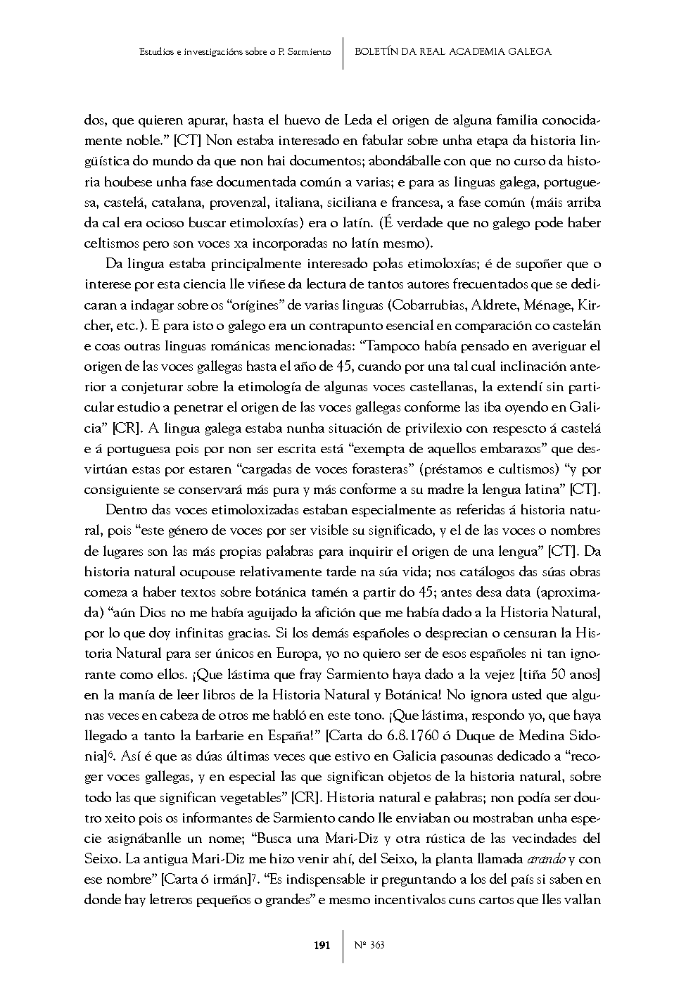 dos, que quieren apurar, hasta el huevo de Leda el origen de alguna familia conocidamente noble.? [CT] Non estaba interesado en fabular sobre unha etapa da historia lingüística do mundo da que non hai documentos; abondáballe con que no curso da historia houbese unha fase documentada común a varias; e para as linguas galega, portuguesa, castelá, catalana, provenzal, italiana, siciliana e francesa, a fase común (máis arriba da cal era ocioso buscar etimoloxías) era o latín. (É verdade que no galego pode haber celtismos pero son voces xa incorporadas no latín mesmo). Da lingua estaba principalmente interesado polas etimoloxías; é de supoñer que o interese por esta ciencia lle viñese da lectura de tantos autores frecuentados que se dedicaran a indagar sobre os ?orígines? de varias linguas (Cobarrubias, Aldrete, Ménage, Kircher, etc.). E para isto o galego era un contrapunto esencial en comparación co castelán e coas outras linguas románicas mencionadas: ?Tampoco había pensado en averiguar el origen de las voces gallegas hasta el año de 45, cuando por una tal cual inclinación anterior a conjeturar sobre la etimología de algunas voces castellanas, la extendí sin particular estudio a penetrar el origen de las voces gallegas conforme las iba oyendo en Galicia? [CR]. A lingua galega estaba nunha situación de privilexio con respescto á castelá e á portuguesa pois por non ser escrita está ?exempta de aquellos embarazos? que desvirtúan estas por estaren ?cargadas de voces forasteras? (préstamos e cultismos) ?y por consiguiente se conservará más pura y más conforme a su madre la lengua latina? [CT]. Dentro das voces etimoloxizadas estaban especialmente as referidas á historia natural, pois ?este género de voces por ser visible su significado, y el de las voces o nombres de lugares son las más propias palabras para inquirir el origen de una lengua? [CT]. Da historia natural ocupouse relativamente tarde na súa vida; nos catálogos das súas obras comeza a haber textos sobre botánica tamén a partir do 45; antes desa data (aproximada) ?aún Dios no me había aguijado la afición que me había dado a la Historia Natural, por lo que doy infinitas gracias. Si los demás españoles o desprecian o censuran la Historia Natural para ser únicos en Europa, yo no quiero ser de esos españoles ni tan ignorante como ellos. ¡Que lástima que fray Sarmiento haya dado a la vejez [tiña 50 anos] en la manía de leer libros de la Historia Natural y Botánica! No ignora usted que algunas veces en cabeza de otros me habló en este tono. ¡Que lástima, respondo yo, que haya llegado a tanto la barbarie en España!? [Carta do 6.8.1760 ó Duque de Medina Sidonia]6. Así é que as dúas últimas veces que estivo en Galicia pasounas dedicado a ?recoger voces gallegas, y en especial las que significan objetos de la historia natural, sobre todo las que significan vegetables? [CR]. Historia natural e palabras; non podía ser doutro xeito pois os informantes de Sarmiento cando lle enviaban ou mostraban unha especie asignábanlle un nome; ?Busca una MariDiz y otra rústica de las vecindades del Seixo. La antigua MariDiz me hizo venir ahí, del Seixo, la planta llamada arando y con ese nombre? [Carta ó irmán]7. ?Es indispensable ir preguntando a los del país si saben en donde hay letreros pequeños o grandes? e mesmo incentivalos cuns cartos que lles vallan