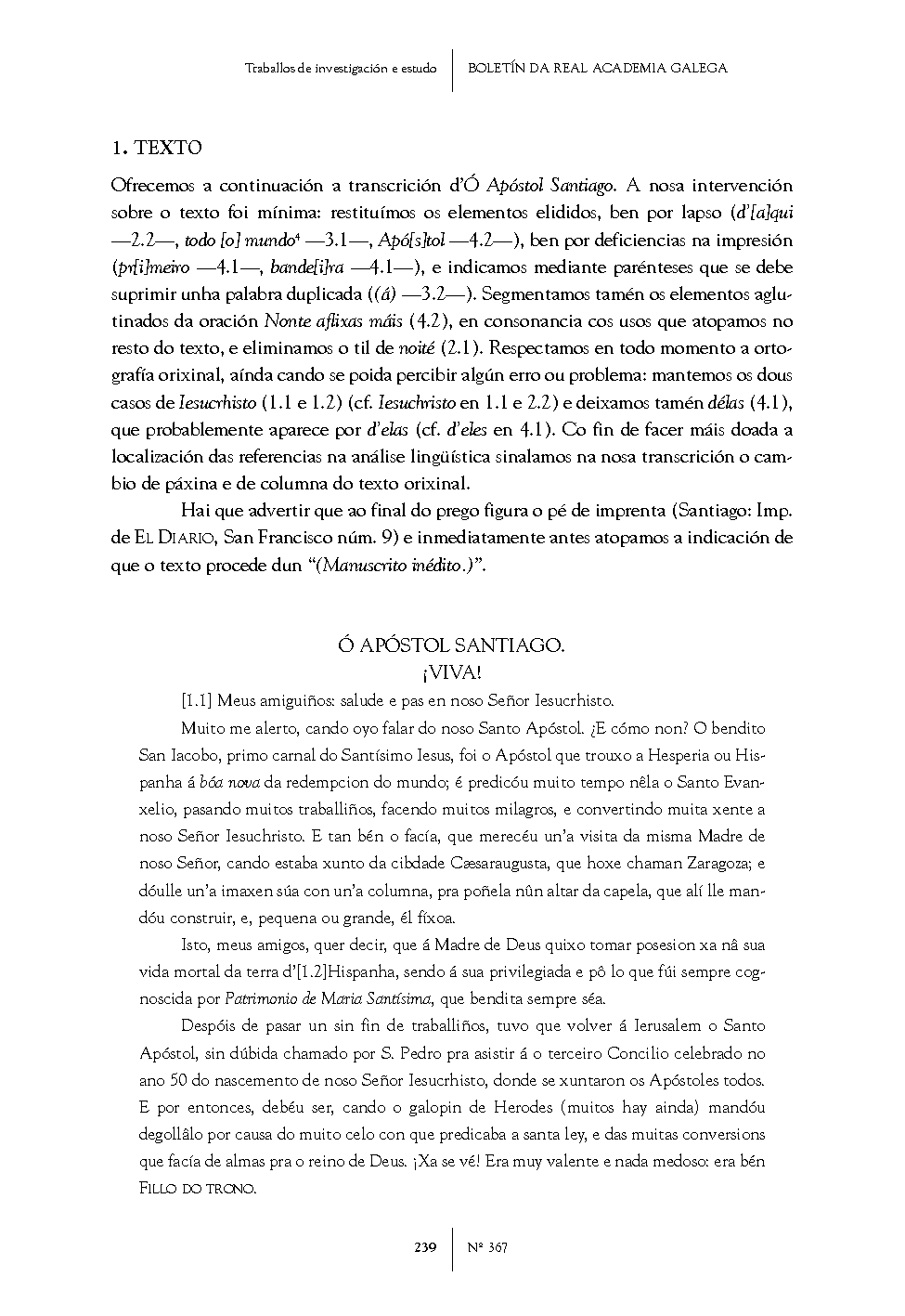 1. TEXTO Ofrecemos a continuación a transcrición d'Ó Apóstol Santiago. A nosa intervención sobre o texto foi mínima: restituímos os elementos elididos, ben por lapso (d'[a]qui ?2.2?, todo [o] mundo4 ?3.1?, Apó[s]tol ?4.2?), ben por deficiencias na impresión (pr[i]meiro ?4.1?, bande[i]ra ?4.1?), e indicamos mediante parénteses que se debe suprimir unha palabra duplicada ((á) ?3.2?). Segmentamos tamén os elementos aglutinados da oración Nonte aflixas máis (4.2), en consonancia cos usos que atopamos no resto do texto, e eliminamos o til de noité (2.1). Respectamos en todo momento a ortografía orixinal, aínda cando se poida percibir algún erro ou problema: mantemos os dous casos de Iesucrhisto (1.1 e 1.2) (cf. Iesuchristo en 1.1 e 2.2) e deixamos tamén délas (4.1), que probablemente aparece por d'elas (cf. d'eles en 4.1). Co fin de facer máis doada a localización das referencias na análise lingüística sinalamos na nosa transcrición o cambio de páxina e de columna do texto orixinal. Hai que advertir que ao final do prego figura o pé de imprenta (Santiago: Imp. de EL DIARIO, San Francisco núm. 9) e inmediatamente antes atopamos a indicación de que o texto procede dun ?(Manuscrito inédito.)?.