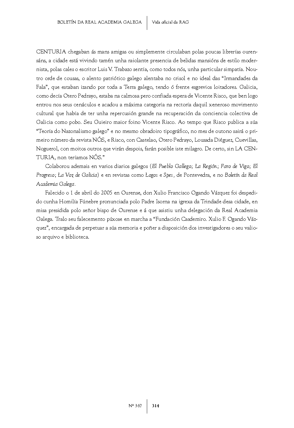 CENTURIA chegaban ás mans amigas ou simplemente circulaban polas poucas librerías ourensáns, a cidade está vivindo tamén unha raiolante presencia de belidas mansións de estilo modernista, polas cales o escritor Luis V. Trabazo sentía, como todos nós, unha particular simpatía. Noutro orde de cousas, o alento patriótico galego alentaba no crisol e no ideal das ?Irmandades da Fala?, que estaban izando por toda a Terra galego, tendo ó frente esgrevios loitadores. Galicia, como decía Otero Pedrayo, estaba na calmosa pero confiada espera de Vicente Risco, que ben logo entrou nos seus cenáculos e acadou a máxima categoría na rectoría daquil xeneroso movimento cultural que había de ter unha repercusión grande na recuperación da conciencia colectiva de Galicia como pobo. Seu Guieiro maior foino Vicente Risco. Ao tempo que Risco publica a súa ?Teoría do Nazonalismo galego? e no mesmo obradoiro tipográfico, no mes de outono sairá o primeiro número da revista NÓS, e Risco, con Castelao, Otero Pedrayo, Lousada Diéguez, Cuevillas, Noguerol, con moitos outros que virán despois, farán posible iste milagro. De certo, sin LA CENTURIA, non teríamos NÓS.? Colaborou ademais en varios diarios galegos (El Pueblo Gallego; La Región; Faro de Vigo; El Progreso; La Voz de Galicia) e en revistas como Logos e Spes, de Pontevedra, e no Boletín da Real Academia Galega. Falecido o 1 de abril do 2005 en Ourense, don Xulio Francisco Ogando Vázquez foi despedido cunha Homilía Fúnebre pronunciada polo Padre Isorna na igrexa da Trindade desa cidade, en misa presidida polo señor bispo de Ourense e á que asistiu unha delegación da Real Academia Galega. Tralo seu falecemento púxose en marcha a ?Fundación Casdemiro. Xulio F. Ogando Vázquez?, encargada de perpetuar a súa memoria e poñer a disposición dos investigadores o seu valioso arquivo e biblioteca.