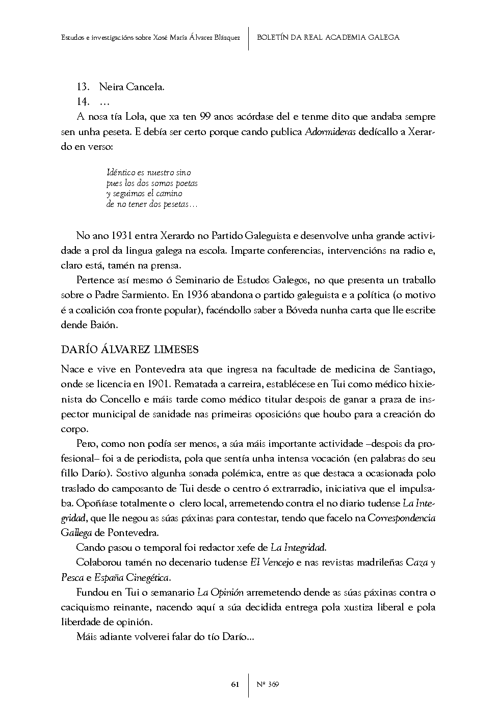 No ano 1931 entra Xerardo no Partido Galeguista e desenvolve unha grande actividade a prol da lingua galega na escola. Imparte conferencias, intervencións na radio e, claro está, tamén na prensa. Pertence así mesmo ó Seminario de Estudos Galegos, no que presenta un traballo sobre o Padre Sarmiento. En 1936 abandona o partido galeguista e a política (o motivo é a coalición coa fronte popular), facéndollo saber a Bóveda nunha carta que lle escribe dende Baión. DARÍO ÁLVAREZ LIMESES Nace e vive en Pontevedra ata que ingresa na facultade de medicina de Santiago, onde se licencia en 1901. Rematada a carreira, establécese en Tui como médico hixienista do Concello e máis tarde como médico titular despois de ganar a praza de inspector municipal de sanidade nas primeiras oposicións que houbo para a creación do corpo. Pero, como non podía ser menos, a súa máis importante actividade ?despois da profesional? foi a de periodista, pola que sentía unha intensa vocación (en palabras do seu fillo Darío). Sostivo algunha sonada polémica, entre as que destaca a ocasionada polo traslado do camposanto de Tui desde o centro ó extrarradio, iniciativa que el impulsaba. Opoñíase totalmente o clero local, arremetendo contra el no diario tudense La Integridad, que lle negou as súas páxinas para contestar, tendo que facelo na Correspondencia Gallega de Pontevedra. Cando pasou o temporal foi redactor xefe de La Integridad. Colaborou tamén no decenario tudense El Vencejo e nas revistas madrileñas Caza y Pesca e España Cinegética. Fundou en Tui o semanario La Opinión arremetendo dende as súas páxinas contra o caciquismo reinante, nacendo aquí a súa decidida entrega pola xustiza liberal e pola liberdade de opinión. Máis adiante volverei falar do tío Darío...