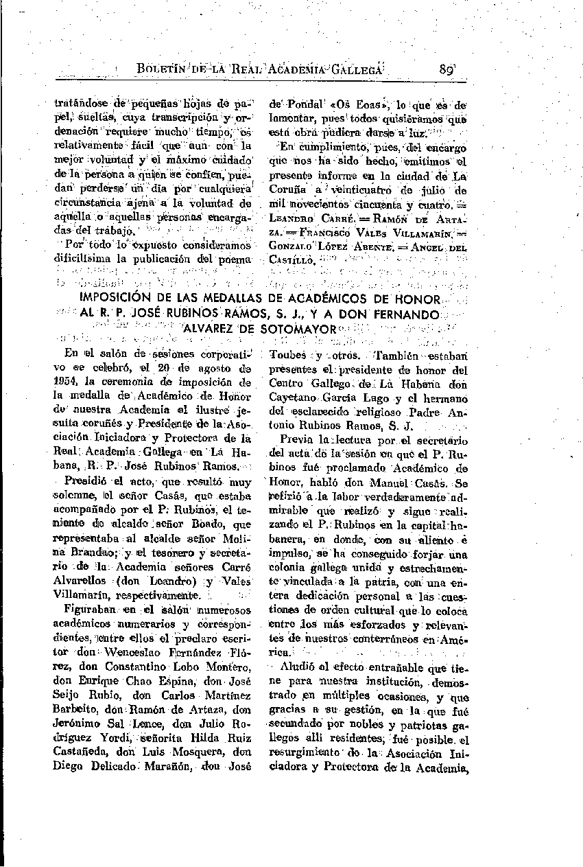 Sección Oficial. Imposición de las medallas de académico de honor al Reverendo Padre José Rubinos Ramos, S.J., y a don Fernando Alvarez de Sotomayor.