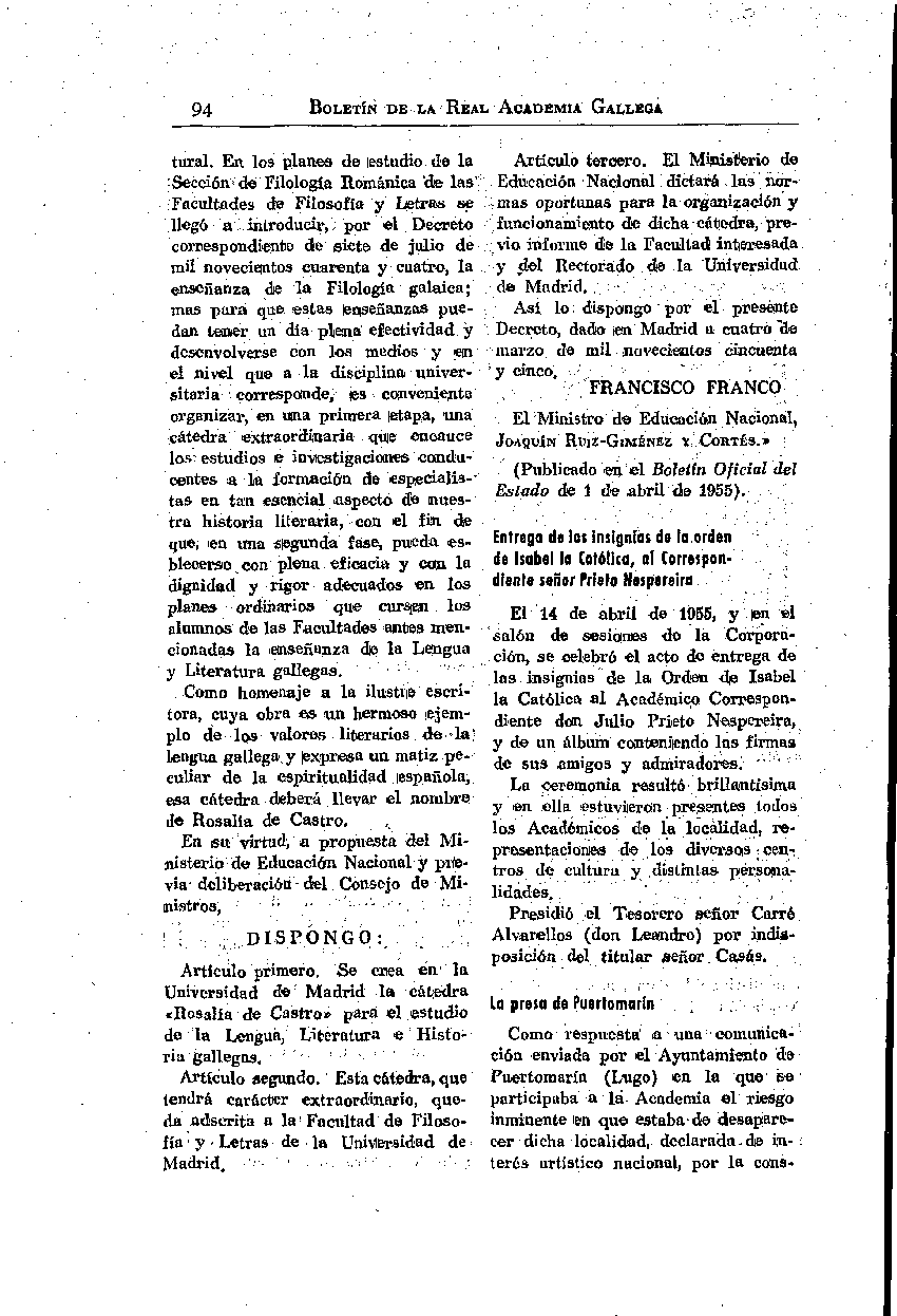Noticias. Entrega de las insignias de la Orden de Isabel la Católica al Correspondiente señor Prieto Nespereira.
