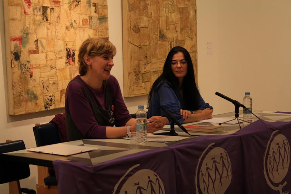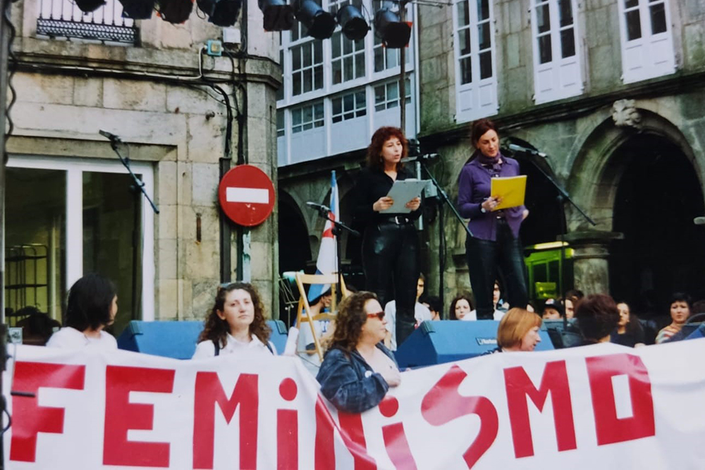 Begoña Caamaño e Ana Romaní dan lectura ao manifesto do 8 de marzo na praza do Toural de Santiago de Compostela.