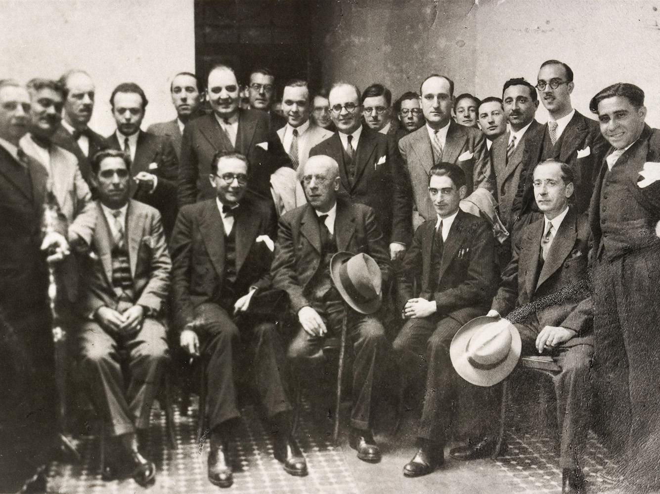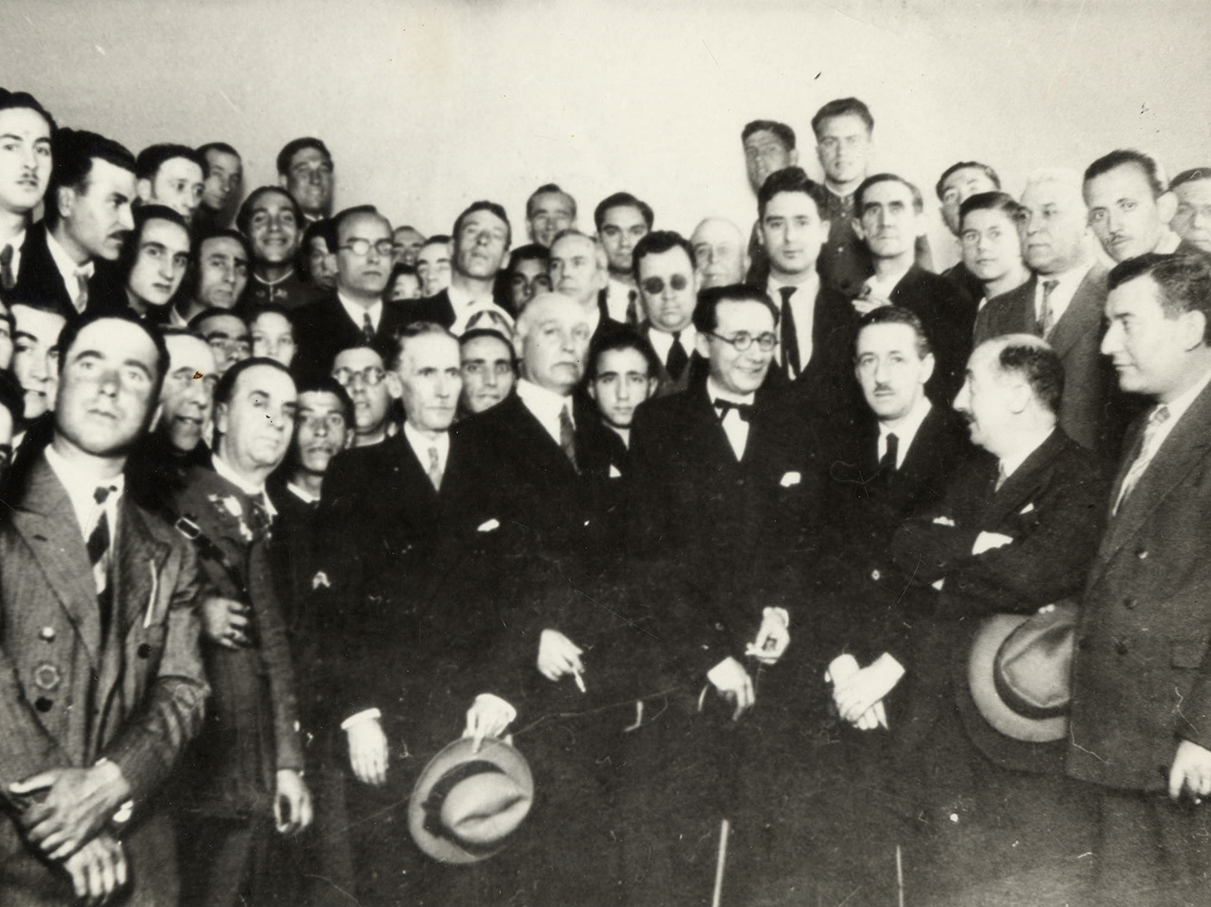 No centro, Manuel Rodrigues Lapa, Manuel Lugrís Freire e Castelao. Á esquerda deles, entre outros, Ramón Vilar Ponte, Francisco Fernández del Riego, Antón Vilar Ponte, Plácido Castro, Ramón Otero Pedrayo, Rodríguez Somoza, Manuel Beiras... Á dereita deles Ramón Suárez Picallo, Carlos Maside, Alexandre Bóveda...