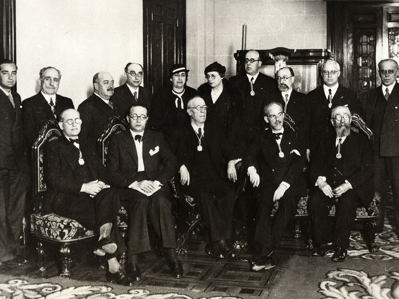Recepción de Castelao como académico de número da Real Academia Galega, 25 de xullo de 1934. De pé, de esquerda a dereita Sebastián González, Eladio Rodríguez, Enrique Peinador, Gonzalo López Abente, Pura González Varela, Celia Brañas Fernández, Ramón Otero Pedrayo, David Fernández Diéguez, Ángel del Castillo e Fernando Cortés. Sentados, Fernando Martínez Morás, Castelao, Manuel Lugrís Freire, Antón Vilar Ponte e Félix Estrada Catoyra.