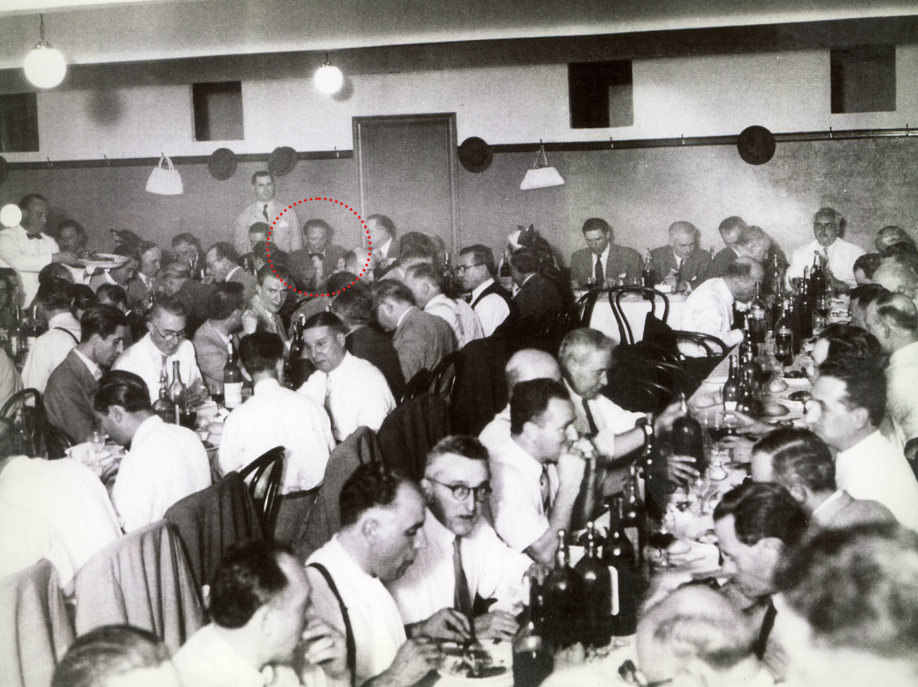 Banquete da Irmandade Galega en homenaxe ao poeta galego Antón Zapata García, gañador do certame organizado pola Agrupación Democrática del Espectáculo Público para a composición dun himno a Stalingrado, co seu poema “Heroico Stalingrado”. O encontro celebrouse o 19 de decembro de 1942 no restaurante El Liberal, na rúa Paraná 1209, Buenos Aires. Colección Pablo Beade.